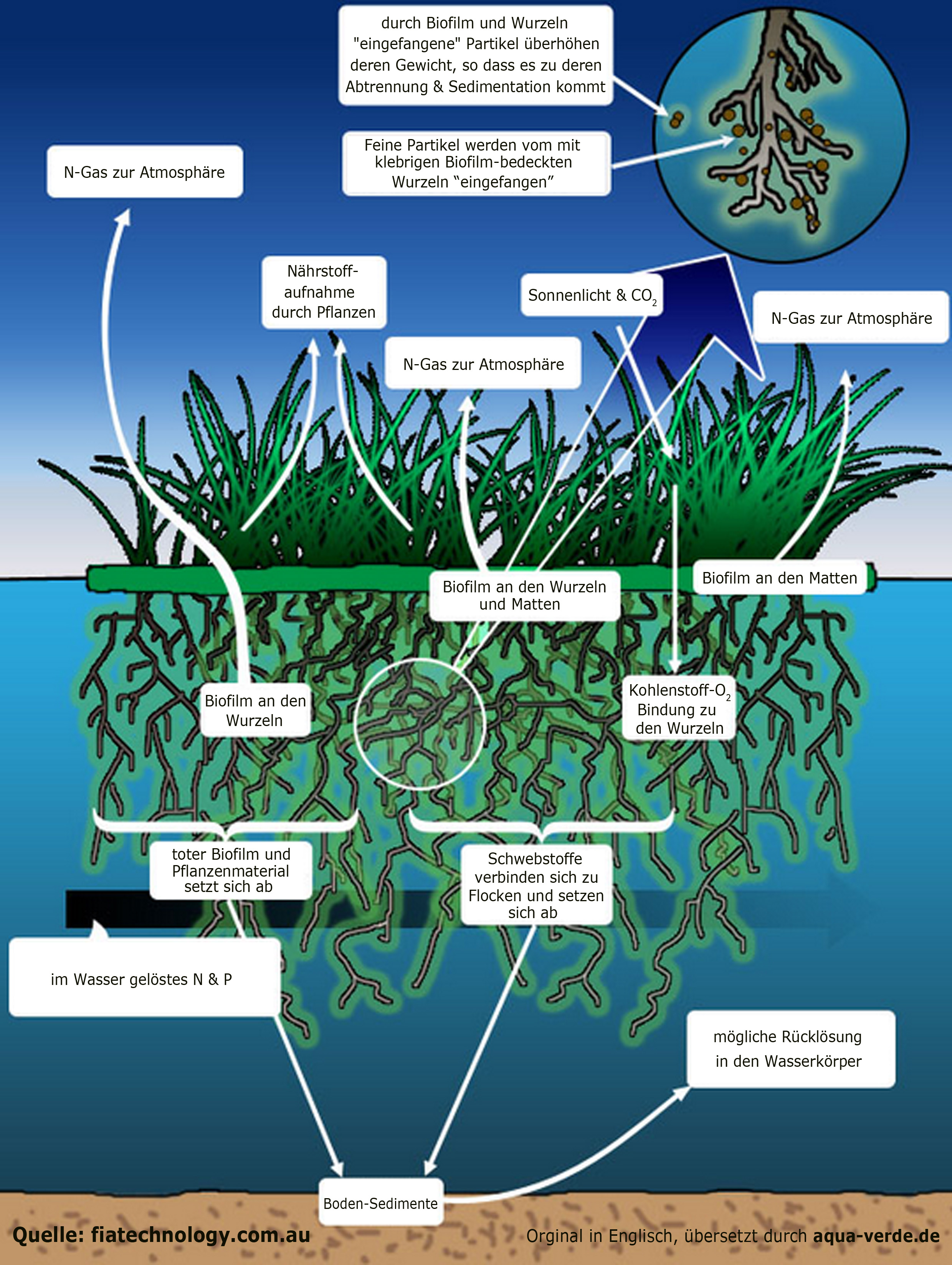 Natürliche Biofilm-Aufwuchsträgerflächen (Sumpfpflanzen-Wurzeln) --> Biofilmbildung + TSS "einsammeln" (Biomasse) --> impulsartige Wellenbewegungen des Wasserkörpers --> natürliches Biofilm-Abschlagen durch Abriss und Neubildung der Wurzelhärchen/Biofilm --> Sedimentation & Nährstoffumwandlung --> periodische Beräumung der Sedimentationen, alles im permanenten natürlichen Kreislauf.